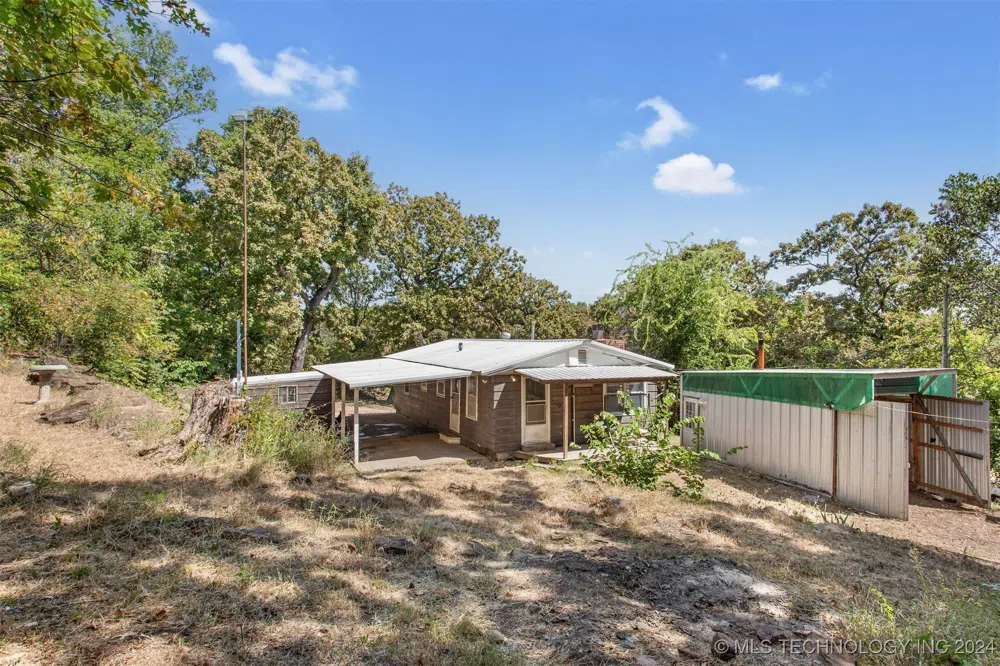 Welcome to Chouteau Ok! Here we have a 2 bedroom 1 bathroom home sitting on 1 acre of land +/-. This House is very easy to maintain. Tons of storage space in the kitchen. Vented wood burning fireplace. Spacious main living area. Very efficient mini splits. Metal roof. Storage shed and shop with electric. CENTURION Generator. Amazing views from the peak of the property. Large boulders. Heavily wooded out back. Double car port with concrete. Fiber optic internet available. Come check it out!!!