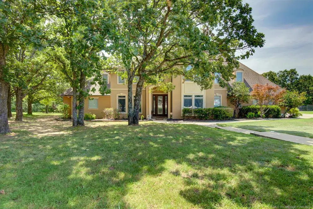 Beautifully designed Brian Wiggs one-owner custom home which sits on a peaceful one acre lot in the exclusive and desirable Timber Ridge Addition, located in the Jenks school district. Home has an open concept with beautiful kitchen that opens into the family and eating area for easy entertaining. Kitchen has granite countertops, built in ovens, large island and large pantry, which adjoins the utility. There is an formal dining room, and office with closet. The spacious master bedroom has it's own patio door which opens onto the peaceful backyard and pool area making for a retreat like setting. The gorgeous backyard has an infinity pool (gunite w/Aquabrite), plus a covered seating area with an outdoor fireplace. The half bath also has an exterior door opening to the pool area for convenience. Wood floors throughout the downstairs, tile in bathrooms and carpet in bedrooms. For convenience there is also a utility room on the second floor to accommodate the four bedrooms, baths and game room. Location is everything and this home has a great location with easy access to the Creak Turnpike, Highway 75, all the Jenks schools, plus shopping and entertainment.